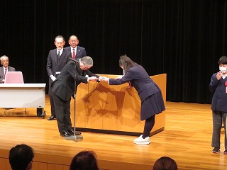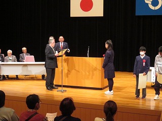 本日、長浜市役所にて「令和7年長浜市功績者表彰式」が行われ、その場にて、3年生の今井 柑那さんが作文発表を行いました。今井さんは「私の思い2025県広場」にて「優良賞」を獲得しましたが、その内容を長浜市の式典でもぜひ皆様に知らせてほしいということからの発表の機会となりました。大勢の方の前での発表でしたが、自らの思いをしっかりと届けてくれました。