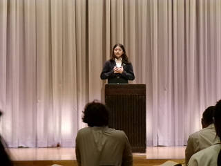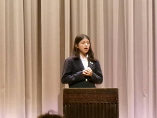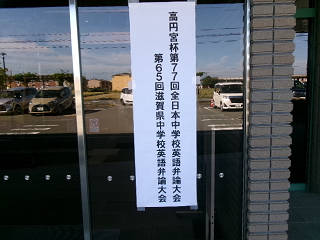 本日(10/6)、高円宮杯全日本中学校英語弁論大会(滋賀県大会)が高島市の安曇川公民館で開催されました。本校からは、ブロック予選で優秀な成績を収めた2年生の田代かおりさんが暗唱の部に出場しました。大きな会場で大勢の前で素晴らしいスピーチをしてくれました。結果は、県3位という優秀な成績でした。おめでとうございます。