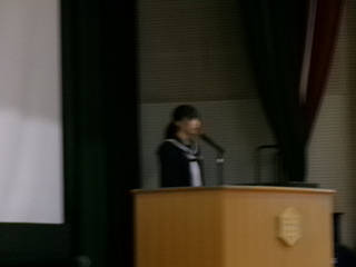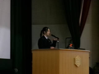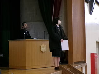 ③「生徒会認証式」:堂守現会長の挨拶のあと、杉野新会長、島田新副会長、廣部新副会長の認証とあいさつがありました。