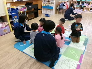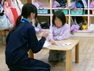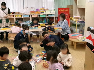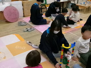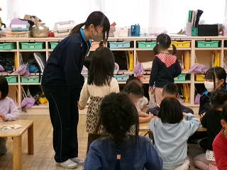 本日も長浜市立北保育園にお世話になり、6クラス目(最終日)の保育実習を行いました。1クラスずつ訪問をしているため、どの生徒たちにとっても初めての経験です。最初は、どのように接したらよいか迷っている3年5組の生徒たちに、園児たちが笑顔で話しかけてくれます。そして、これに引っ張られるように生徒も笑顔になります。