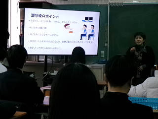 本日も田中スクールカウンセラーが、「緊張をほぐす」「心の整え方」をテーマに3年生に向けて授業を行いました。緊張は誰にでも起こる自然な反応ですが、それを「悪いこと」や「失敗の前兆」と捉えがちな人もいます。しかし、今日の話の中でもありましたが、「緊張しても大丈夫」、「緊張した時にはどう扱えばいいか知っている」 という安心感を持てることのほうが重要です。本日は心の専門家からうまく付き合えるコツを学びました。
