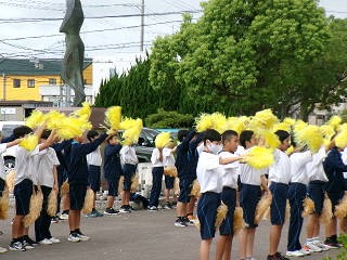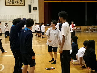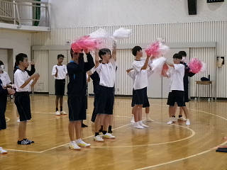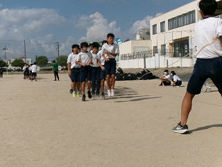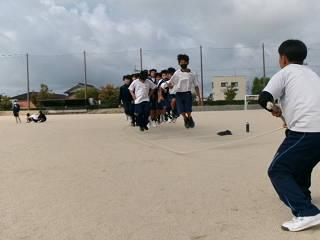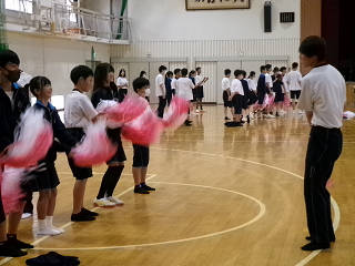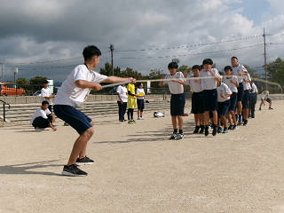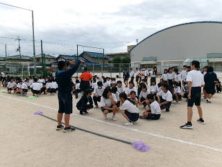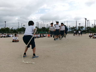 本日は各団に分かれて「長縄練習」や「団アピール練習」を行いました。長縄跳びは各学級ごとに行うのですが、さすがは3年生です。うまく飛べていない後輩のために見本を見せたり、アドバイスをしたりしていました。また、「団アピール」練習では、3年生が1,2年生を少人数に分け、見本を見せながら丁寧に指導していく姿が見られました。こうして3年生も1.2年生も成長していくのがうれしい姿です。体育祭本番が楽しみです。