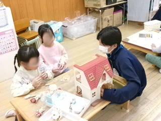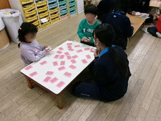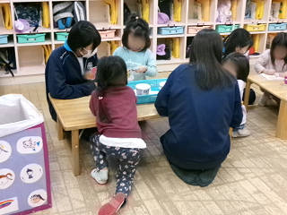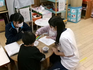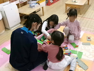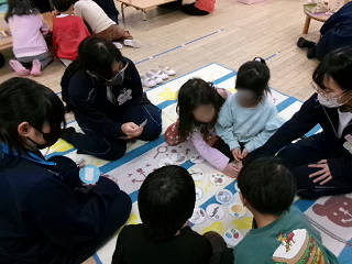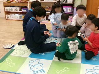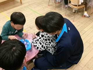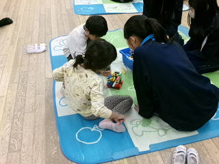 本日(11/25)から長浜市立北保育園のご協力のもと、クラスごとの「保育実習」をさせていただいております。これは、家庭科の授業の一環として実施しているもので、本日は3年2組がお邪魔しました。最初は緊張気味な生徒でしたが、すぐに園児たちの笑顔に引っ張られるように生徒たちの表情も緩んできました。