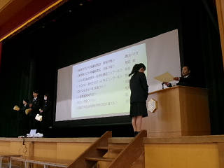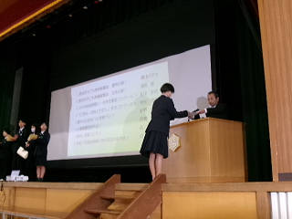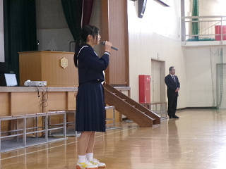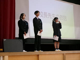 ③「生徒会認証式」:堂守現会長の挨拶のあと、杉野新会長、島田新副会長、廣部新副会長の認証とあいさつがありました。